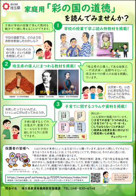 家庭用「彩の国の道徳」は、県ホームページに電子版・家庭用「彩の国の道徳」を掲載し、全ての家庭で活用していただけるようにしています。