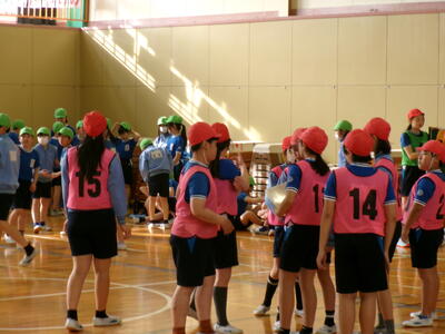 3月9日(金)5・6時間目、5・6年生合同でバスケットボールの試合を行いました。6年生は、1学期のバスケットボール大会で学んだチームワークや高めたシュートやパスなどの技術を5年生に伝えることができました。どの試合も白熱した試合となり、5年生も来年度の球技大会に向けてさらに意識を高めることができました。