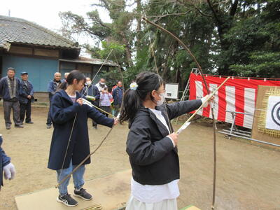 鴻巣市指定無形文化財でもある「的祭(まとうさい)」が滝馬室氷川神社で行われました。参加してくれた馬室っ子は、氏神様に祝詞を奏上したのち、代表児童が天と地に向けて矢を射ます。その後、大蛇の目に見立てた的に向かって矢を射ました。手作りの弓矢で挑戦しましたが、経験したことがないため、なかなか上手に放つことができません。それでも、要領を得て的に当たると歓声があがりました。子供たちが地域の伝統行事を通して、郷土を愛するこころを育むことができました。ご協力いただきました皆様にお礼を申し上げます。
