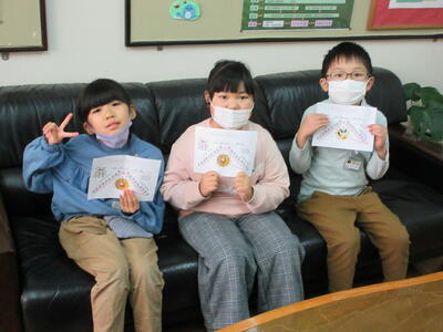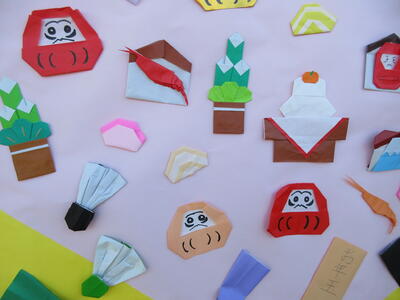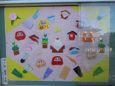 正門に入って左で側にある掲示板には、掲示委員会やポピー学級の児童が作成してくれた季節の掲示があります。年明けらしく、明るく縁起のよい作品となりました。