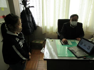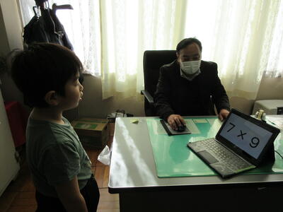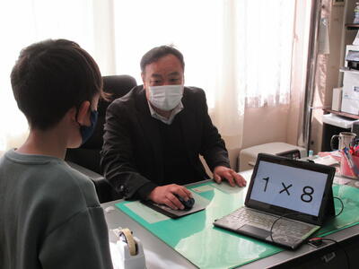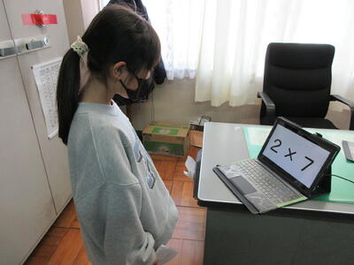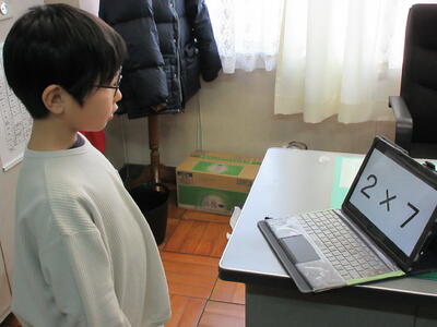 2学期に学習したかけ算九九が定着するように、先週から2年生のかけ算九九検定が始まりました。担任の先生による上り九九と下がり九九の確認が終わったら校長室へ、PCの画面でバラ九九(ランダムに問題が出てくる。)をスムーズに答えられたら合格です。普段はすらすら言えるのに、校長先生の前だと緊張してしまうようです。しかし、冬休み中に練習してきた成果を発揮して、プレッシャーを跳ねのけて、次々と合格していく2年生です。