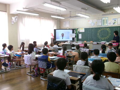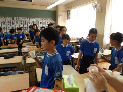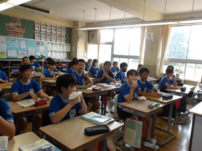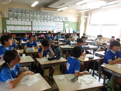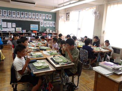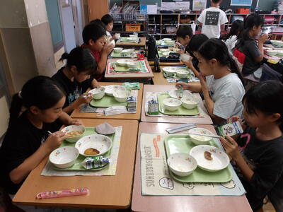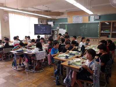今回は4年1組の給食の様子をお届けします。暑さの厳しい日が続いていますが「今日の給食も美味しいですか?」と聞くと、「とても美味しいです!」と元気な声が帰ってきました。班の友達との会話も楽しみながら和気あいあいと給食を食べる様子も印象的でした。