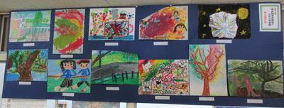 一学期に制作して出品した身体障害者福祉のための美術展で、入賞した作品を職員室前の廊下に飾っています。色彩や構図に工夫の見られる力作がそろっておりますので、個人面談でお越しの際にご覧ください。