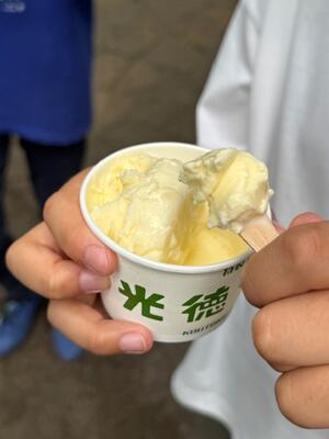 天候を考慮してバスで光徳牧場へ向かいました。ここでは楽しみの一つであるアイスクリームを食べることができました。天候の大きな崩れはありません。子供たちは、一人一人に配られたカップのアイスをおいしそうに食べています。
