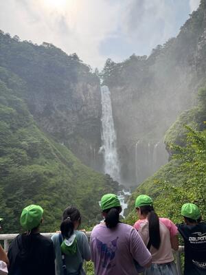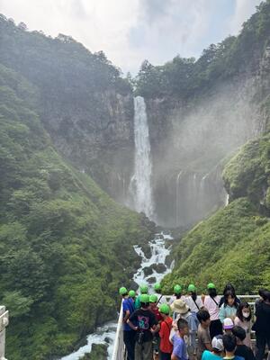 華厳の滝を見学しました。大型のエレベーターで下まで行くのですが、少しひんやりとしています。中禅寺湖から流れ落ち、高さのある華厳の滝は絶景ですが、さらに今年は水量も多くとても迫力があり、子どもたちも感嘆の声を上げていました。見学している観瀑台まで、水飛沫がやってきました。記念撮影をとりました。