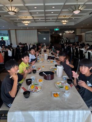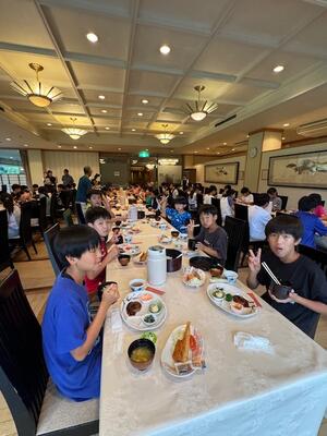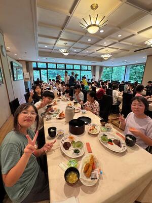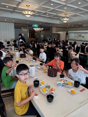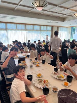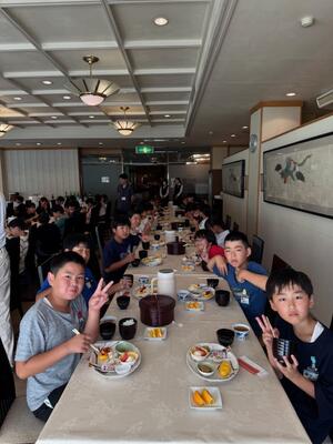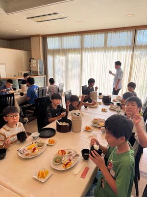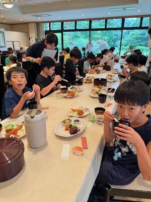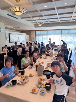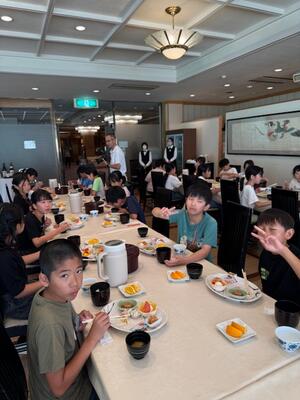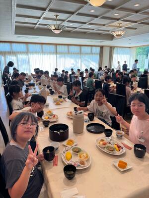 お腹を空かして朝食の時間を待ち望んでいた児童も多く、全員しっかりと朝食を取ることができました。今日も元気に活動できそうです。