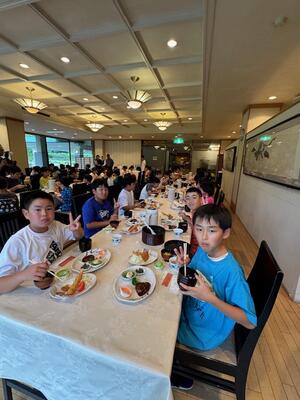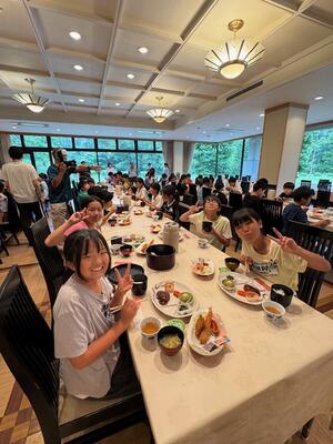 お弁当も早く、たくさん活動したので子どもたちは、お腹がペコペコのようでした。おいしそうな夕食を前にしっかりとあいさつもできました。どの子もおいしい食事を楽しくしっかりと食べていました。みんな元気に過ごしています。