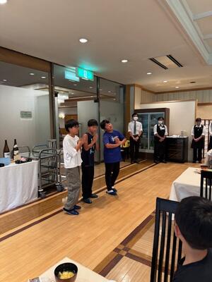 部屋に入って荷物を整理し、検温をすませて休憩した後に室長会議が行われました。室長は、班員に話を伝えて指示する大切な役目があります。どの室長も先生の話を真剣に聞いてメモをとっています。そのしっかりした姿から責任感を感じることができました。