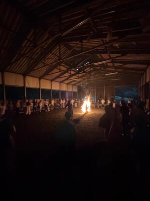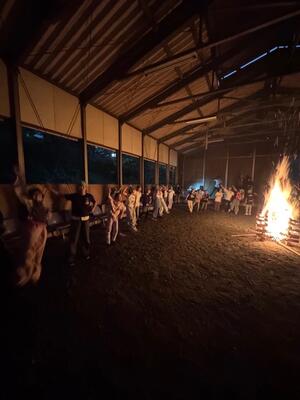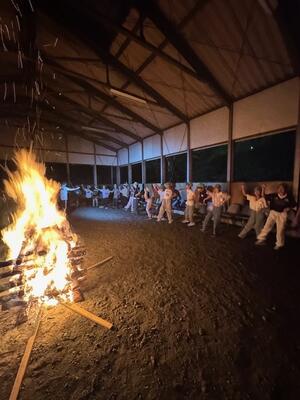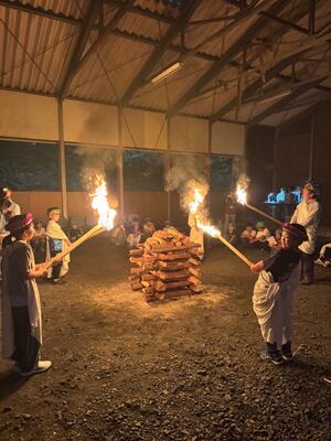 雨が心配されたので屋内キャンプ場施設でキャンプファイヤーを実施しました。燃えろよ燃えろの歌声とともに、火の神と火の子が入場し、井桁に火を点火しました。歌やダンス、ゲームで子どもたちは楽しい時間を過ごしました。
