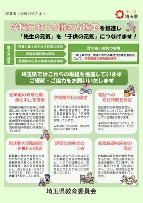 「学校における働き方改革リーフレット」の掲載について 投稿: 馬室小学校 (2023/05/15) 埼玉県教育委員会より、「学校における働き方改革リーフレット」が届きました。埼玉県ではこれらの取組を推進しています。保護者・地域の皆様には、学校における働き方改革へのご理解・ご協力をお願いいたします。 クリックするとダウンロードできます。