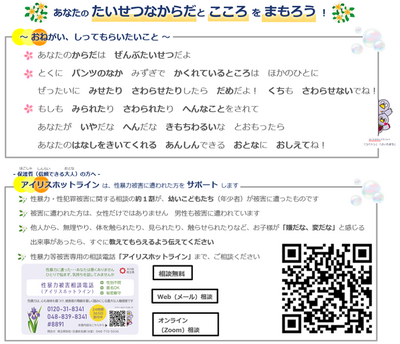 性暴力犯罪被害専用相談電話「アイリスホットライン」について 投稿: 馬室小学校 (2025/12/15) 県民生活部防犯・交通安全課長より連絡がありましたので、お知らせします。 アイリスホットラインHPはこちらからhttps://www.svsc8080.jp/iris/