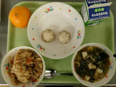 12月8日(月)のメニュー:牛乳、ビビンバ風炊き込みご飯、しょうろんぽう、わかめスープ、みかん