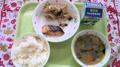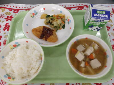 12月11日(木)のメニュー:牛乳、ごはん、メバルフライ、白菜のごまあえ、いものこ汁