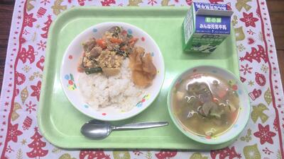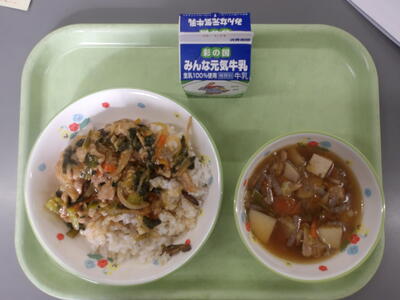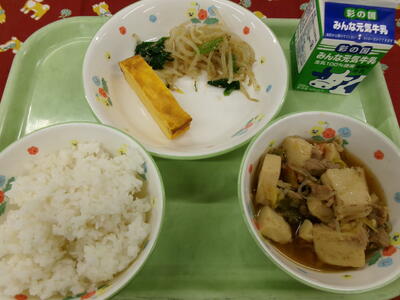 1月20日(火)のメニュー:牛乳、こまつな豚みそ丼、けんちん汁