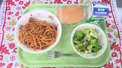 12月17日(水)のメニュー:牛乳、コッペパンスライス、スパゲティボロネーゼ、フランクフルト、フラワーサラダ
