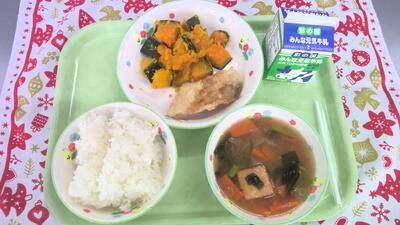 12月18日(木)のメニュー:牛乳、ごはん、たらのゆず風味、かぼちゃの甘煮、みぞれ汁