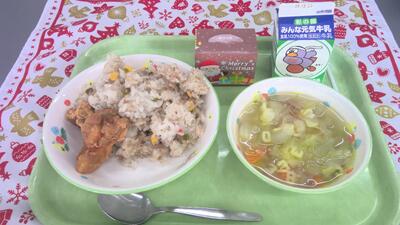 12月19日(金)のメニュー:牛乳、ツナとコーンのピラフ、フライドチキン、アルファベットスープ、クリスマスケーキ