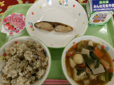 10月7日(火)のメニュー:牛乳、ごはん、にしんの照り焼き、おふくろ煮、なめこのみそ汁