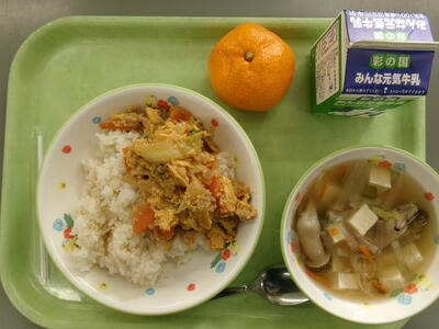 5月20日(火)のメニュー:牛乳、ごはん、豚肉の生姜炒め、かきたま汁、冷凍みかん