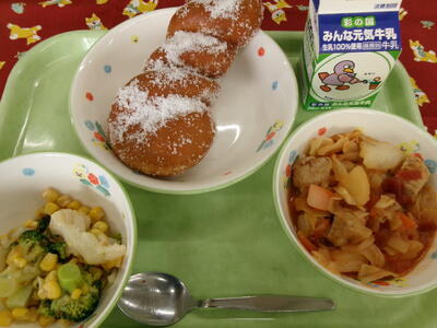 1月15日(水)のメニュー:牛乳、シュガー揚げパン、ボルシチ、フラワーサラダ