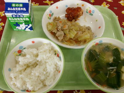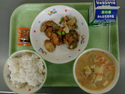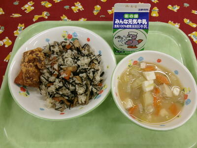 2月25日(水)のメニュー:牛乳、ひじきごはん、ザンギ、石狩汁