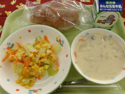 今日は、アジについて紹介します。アジは魚の中でもタンパク質が多く含まれているそうです。それは、体を作るもとになる成分が多いということと、「うまみ」もたくさん含まれているということになります。おいしいアジが運動会練習を頑張る体に嬉しいメニューでした。