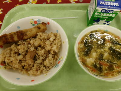 6月9日(月)のメニュー:牛乳、わかめ菜飯、鶏肉の塩こうじ焼き、かき玉汁、チーズ