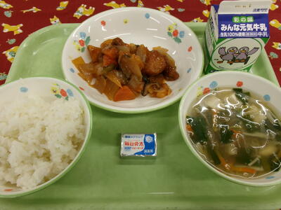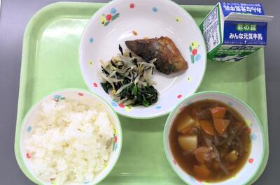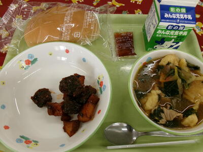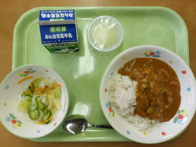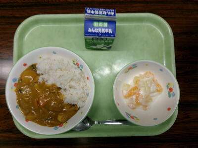 今日の給食は、数あるメニューの中でも常に子どもたちに人気のカレーです。一般にカレーと呼んでいるものは、インドで「香辛料やハーブを使った汁状の料理」を表す単語だそうです。スパイシーな料理を総称して、英語で「カレー」と呼ばれるようになりました。日本へは明治初期にイギリスから料理法と共にカレー粉が渡来し、「ライスカレー」として、国内に広まっていきました。今日も美味しくいただきました。