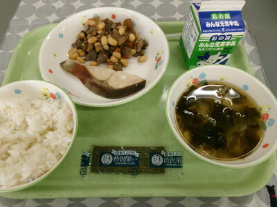 1月27日(火)のメニュー:牛乳、ごはん、のり、鮭の塩焼き、五目煮豆、じゃがいものみそ汁