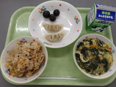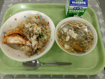 10月20日(月)のメニュー:牛乳、チャーハン、焼き餃子、チンゲン菜と卵のスープ