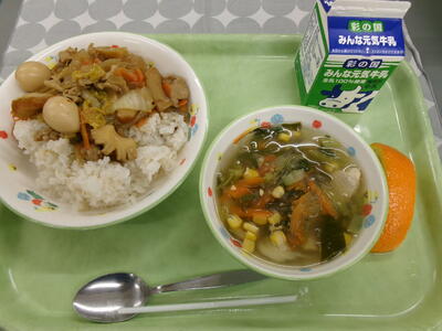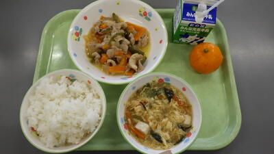 2月5日(木)のメニュー:牛乳、中華丼、五目スープ、いよかん