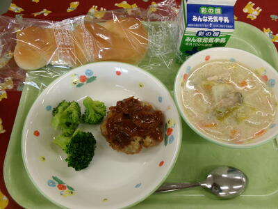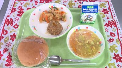 12月1日(月)のメニュー:牛乳、こどもパンスライス、照り焼き豆腐ハンバーグ、ポテトきんぴら、洋風かき玉スープ