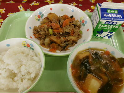 2月10日(火)のメニュー:牛乳、ごはん、揚げじゃがのそぼろ煮、みぞれ汁