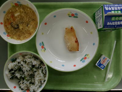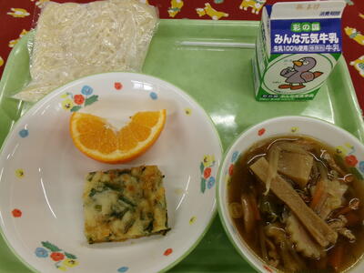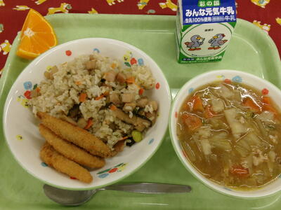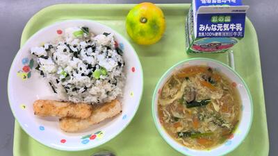 今日の給食の主食は、わかめと小松菜の混ぜご飯でした。塩味がきいていて美味しかったですね。主菜のイカのかりん揚げの名前の由来はふたつあり、一つは揚げたイカが黄金色に色づき、果物のかりんの実ににていることから、もう一つは揚げた色と形がかりんとうに似ていることから名づけられたという説です。柔らかいイカのかりん揚げも、卵いっぱいのかきたま汁も美味しくいただきました。みかんは、今シーズン初めて食べた子も多かったのではないでしょうか。しっかり食べて、丈夫な体をつくりましょう。