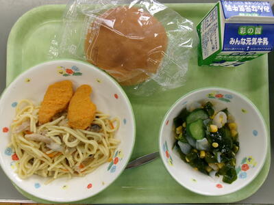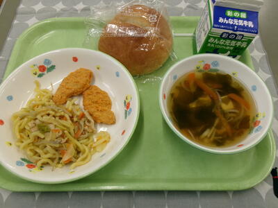 2月17日(火)のメニュー:牛乳、ライスボールパン、塩焼きそば、チキンナゲット、わかめスープ