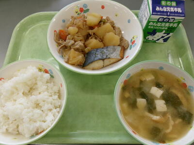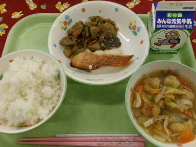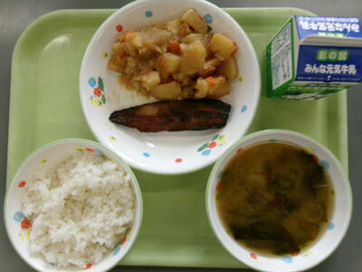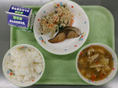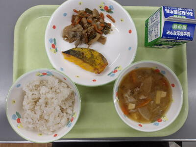 10月9日(木)のメニュー:牛乳、ごはん、鮭のもみじ焼き、れんこん金平、豚汁
