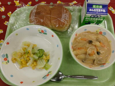 今日のシチューに入っていた白菜は、食物繊維やカルシウム、ビタミンCが多く含まれていて、中でもカリウムが多く含まれている野菜です。カリウムには、取り過ぎた塩分を体から排出する働きがあるので、高血圧予防やむくみの解消に効果があります。給食では白菜のシチューを作りました。今日はホワイトルーではなく、米粉を使ってとろみをつけたそうです。あっさりとした味わいで、からだも温まりました。