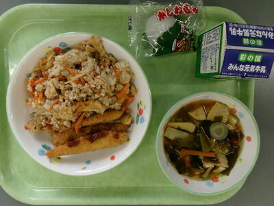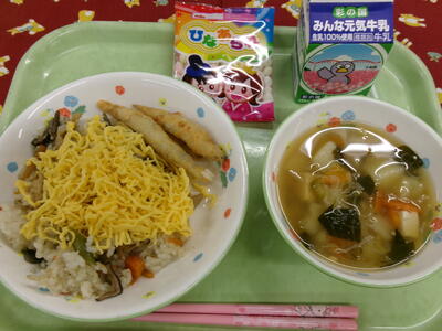 5月2日(金)のメニュー:牛乳、こぎつねずし、こいわしフライ、わかたけじる、かしわもち