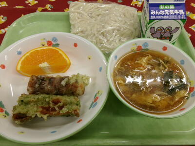 今日は、春雨スープやチャーハンに入っていたにんじんについてのお話です。にんじんの生まれ故郷はアフガニスタンと言われています。もともと日本でにんじんと呼ばれていたのは、漢方薬の「朝鮮人参」のことでした。朝鮮人参は根が分かれて「人」の形のようであったので、人参という名前になったと伝えられています。ビタミンたっぷりの野菜をたくさん食べて、風邪に負けない元気な体づくりをしましょう。