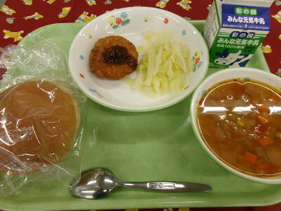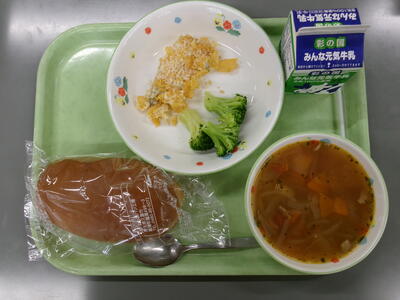 今日のホキのこんがり焼きの衣には、パン粉に加えコーンフレークがまぶされていました。サクッとした触感が楽しい献立です。ミネストローネには、たくさんの野菜が使われており、栄養満点です!今日もおいしく楽しくいただきました。