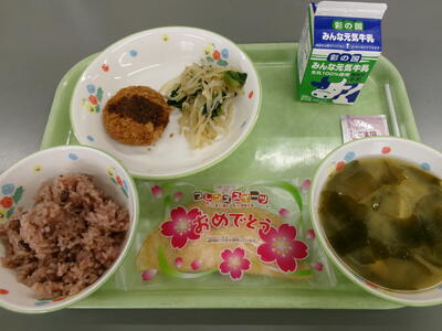 今日は3学期最終、そしてクラスの仲間や先生と食べる最後の給食でもあります。6年生は卒業・在校生は学年の節目のお祝いにお赤飯でした。日本では古くから赤飯は邪気を払う力があると考えられ、お祝いの席でふるまわれるようになりました。1年間の給食を振り返りながら、楽しく美味しくいただきました。