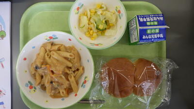 春キャベツを使ったグリーンサラダは、野菜の甘みを感じられました。マカロニのヒリヒリあえは、ほんのりオレンジがかった色をしていて、少し辛みがあり美味しかったです。はちみつぱんはほんのり甘く、牛乳ととても合いました。今日も美味しくいただきました。