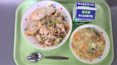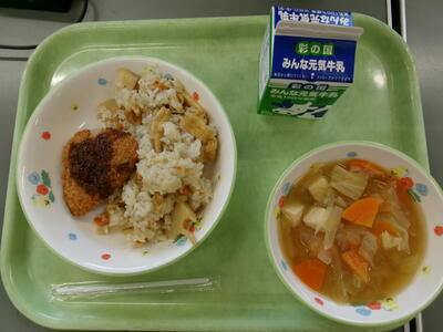 5月8日(木)のメニュー:牛乳、たけのこごはん、かつおフライ、春キャベツのみそしる