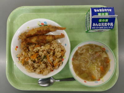 5月19日(月)のメニュー:牛乳、キムチチャーハン、ししゃもフライ、ワンタンスープ
