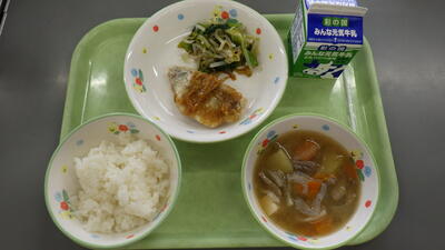 今日の給食は、冬が旬の大根をたっぷり使ったみぞれ汁でした。大根おろしとお汁で、雨と雪が混ざった「みぞれ」のイメージで仕上がっていました。さっぱりおいしくいただきました。