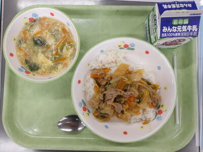 今日のメニューの酢豚は、日本の家庭料理としてもおなじみで、香ばしく揚げた豚肉と、色とりどりの野菜の甘酢あんであえた料理ですが、広東(かんとん)料理がルーツです。給食では、ケチャップを使って食べやすい甘酢あんになっています。今日も美味しくいただきました。