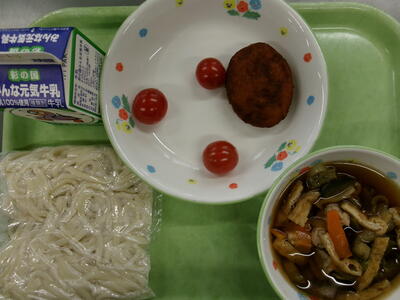 6月13日(金)のメニュー:牛乳、なすのつけ汁うどん、ゼリーフライ、ミニトマト