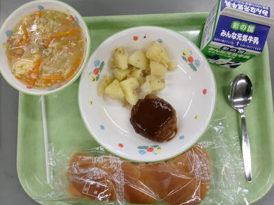 6月16日(月)のメニュー:牛乳、ツイストパン、ハンバーグ、ジャーマンポテト、洋風かき玉スープ