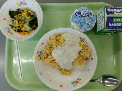 2学期の給食がスタートしました。みんなの大好きなメニューです。カレーの隠し味に、しょうがやニンニクも入っています。まだまだ残暑が厳しいですので、しっかり食べて、学習に運動に頑張りましょう。