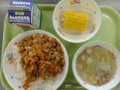 今日の給食のメニューのとうもろこしはこれから旬になる食べ物で、糖質やたんぱく質、脂質が多くエネルギーが高いと言われています。収穫後から味や栄養価も落ちていくということで、収穫したらすぐに食べるのが美味しく、上手に栄養も取れて良いのかもしれませんね。厳しい暑さが続きますが、季節の食べ物を美味しく食べ元気に過ごしていきましょう。